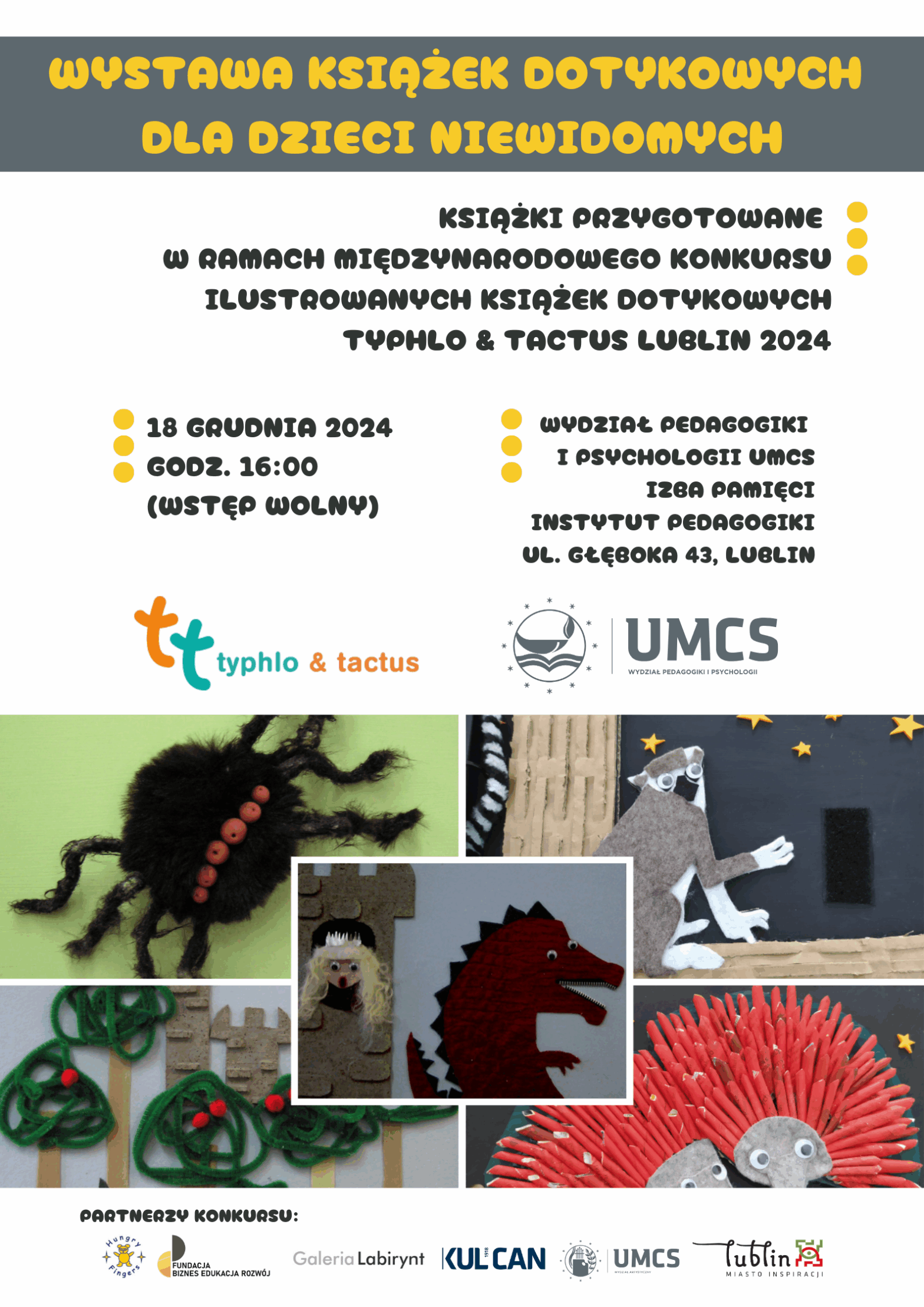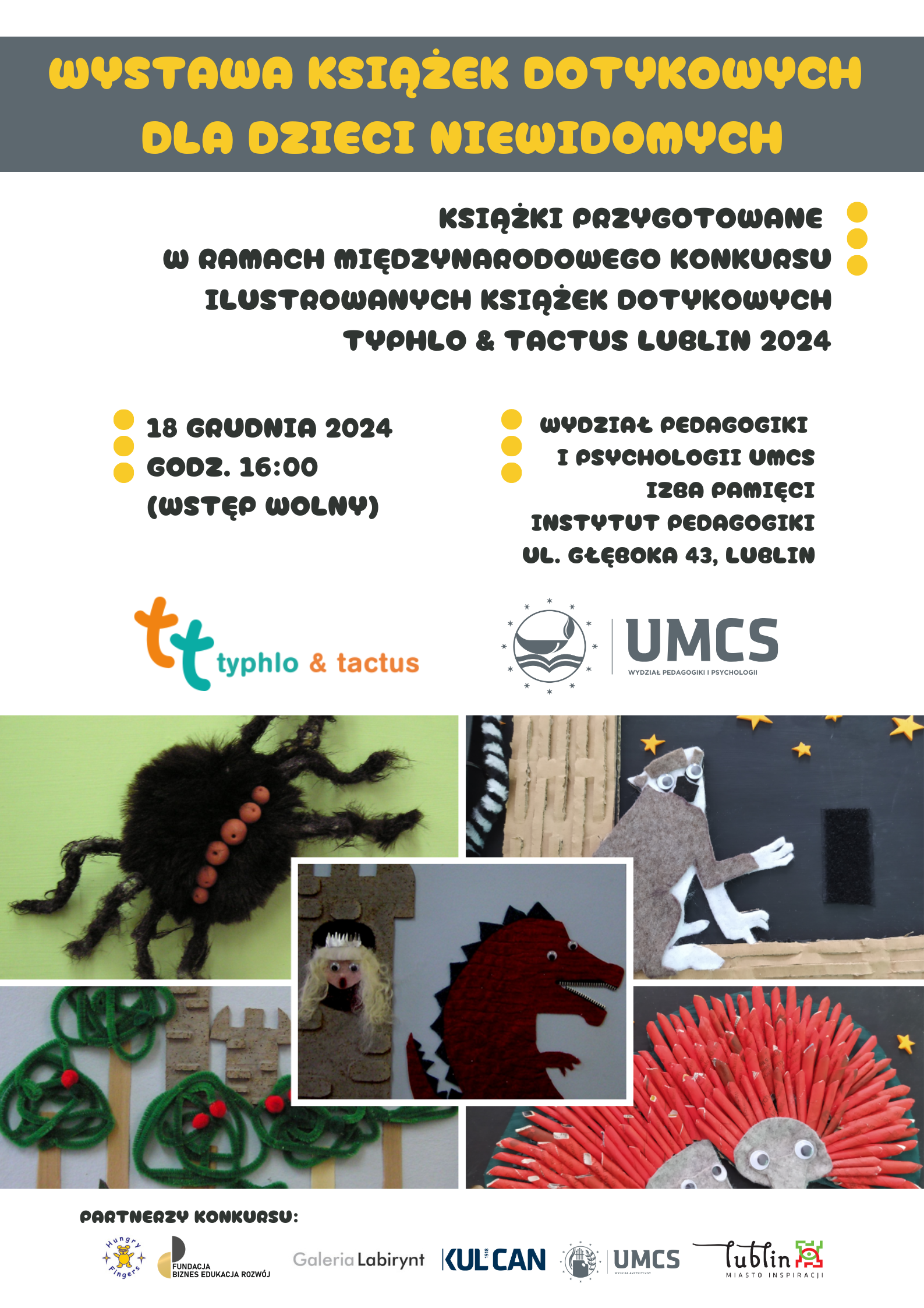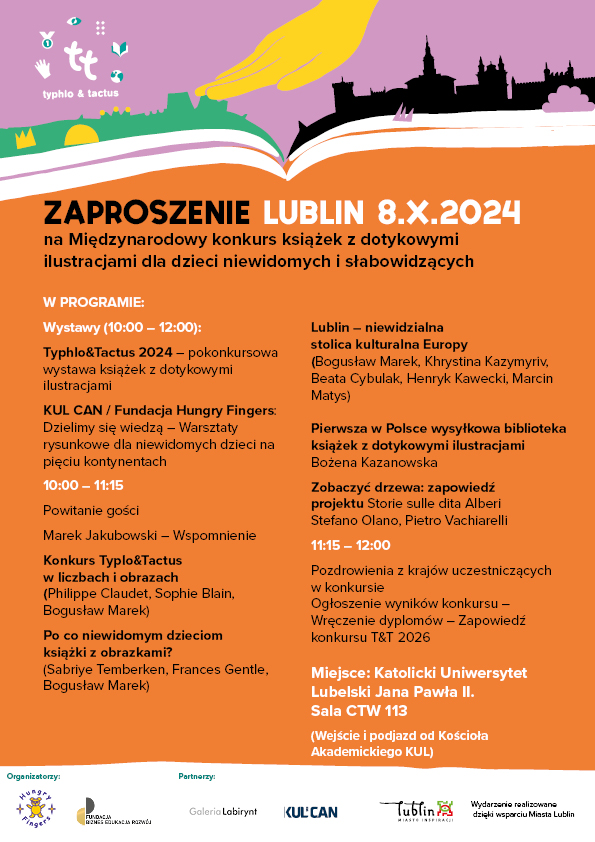 Lublin – niewidzialna stolica kultury Projekt zrealizowany dzięki wsparciu Miasta Lublin Galeria Zaproszenia Typhlo&Tactus Poland 2024 Obrady jury Typhlo&Tactus Poland 2024 - Galeria Labirynt IMG_5510 Mini gala Typhlo&Tactus Poland 2024 wraz z wystawą pokonkursową - Katolicki Uniwersytet Lubelski im. Jana Pawła II Wystawa pokonkursowa Typhlo&Tactus Poland 2024 - Wydział Pedagogiki i Psychologii UMCS